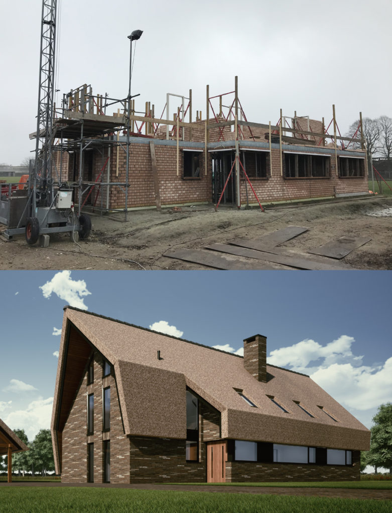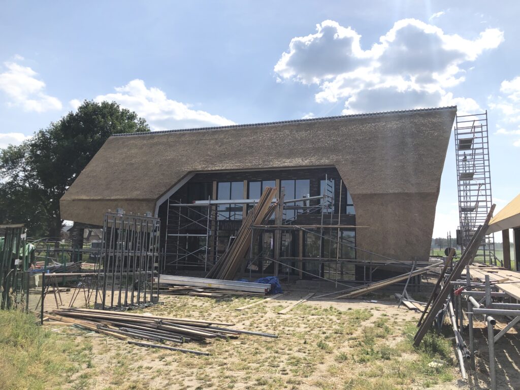 In Hilvarenbeek zijn de rietdekkers begonnen met het dak. De contouren van de woning komen steeds beter naar voren. Straks